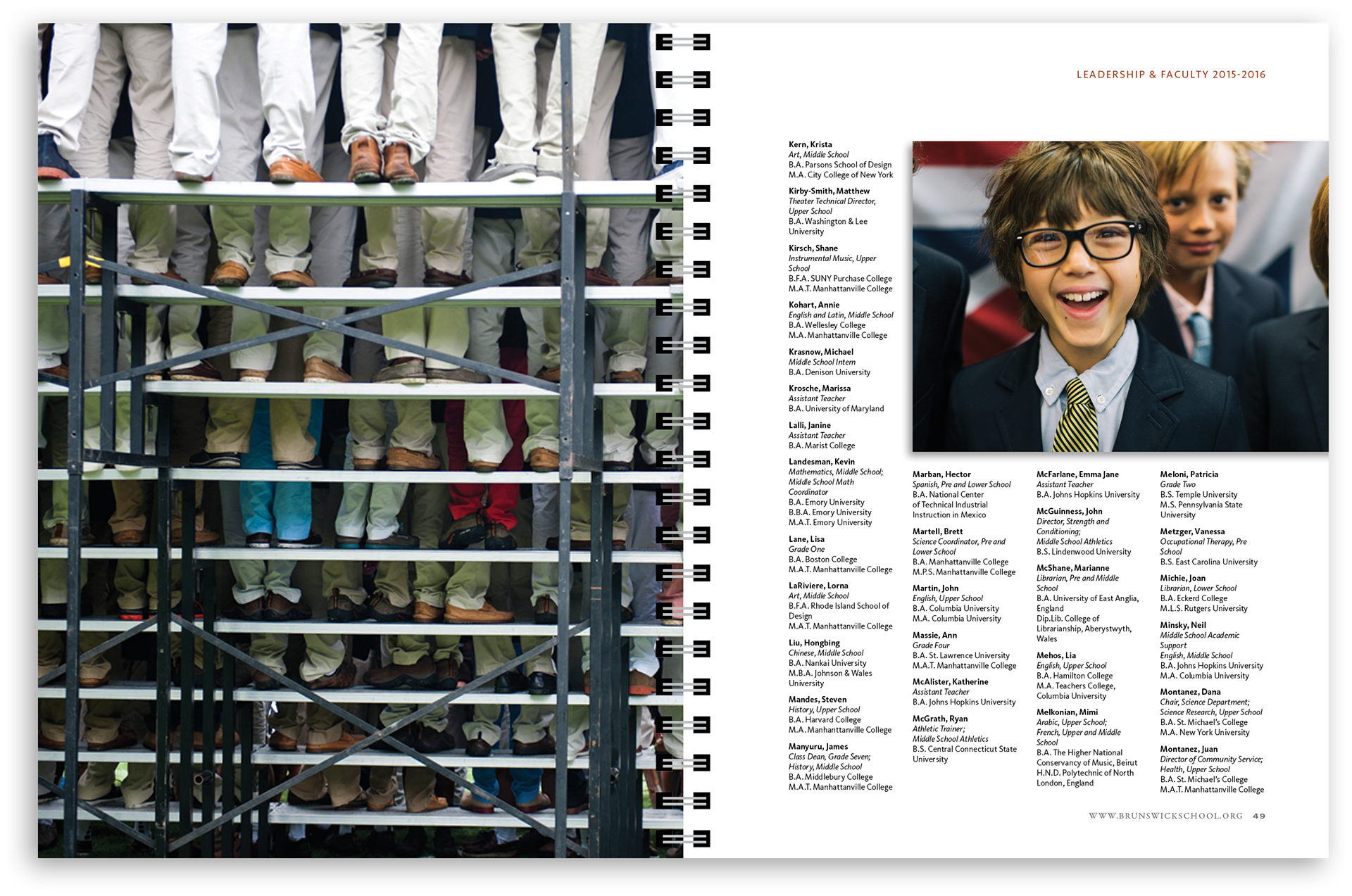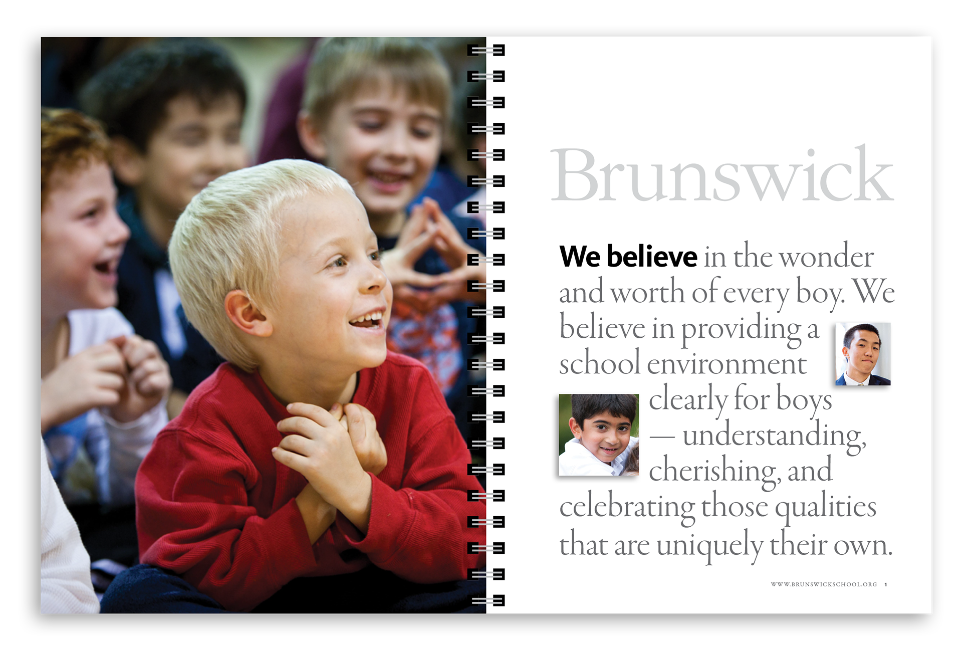 The Brunswick viewbook captures the school's special atmosphere of brotherhood, service and learning. “We believe” emerged as a strong theme as the communications director and I worked through early iterations of text. We decided to highlight that phrase throughout the book, underscoring the strong principles of “courage, honor and truth” that are the foundation of the school’s mission.